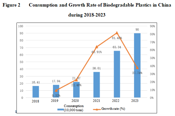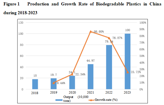 China’s biodegradable plastic industry started relatively late, but has developed rapidly under the dual factors of policy support and market demand. Currently, China has become the world’s largest producer of biodegradable plastics. In 2018, China produced 180,000 tons of biodegradable plastics, with a total output of 795,400 tons in 2022 and 1 million tons in 2023. The compound annual growth rate was about 44.19% during 2018-2023.