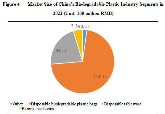 Biodegradable plastic products mainly include express packaging, disposable tableware, disposable biodegradable shopping bags, and other products (such as agricultural film). The market for disposable biodegradable shopping bags and disposable tableware is relatively large, while the market for express packaging is relatively small. In 2022, the market size of disposable biodegradable shopping bags was 11.475 billion yuan, the market size of disposable tableware was 3.467 billion yuan, the market size of express packaging was 754 million yuan, and the market size of other markets was 353 million yuan. The market size of disposable biodegradable shopping bags accounts for 71.50% of the market size of biodegradable plastic products.
