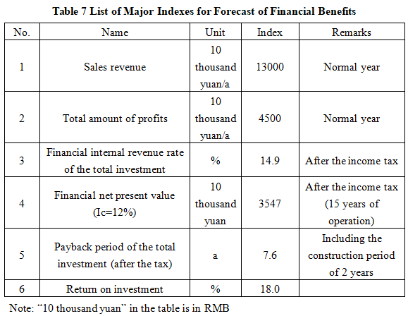 After the project reaches the production capacity, its annual sales revenue will be 130 million yuan, its profit will be 45 million yuan, its investment payback period will be 7.6 years (after the tax, including the construction period of 2 years) and its return on investment will be 18.0%.
