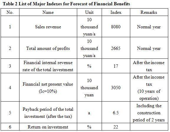 After the project reaches the production capacity, its annual sales revenue will be 80.8 million yuan, its profit will be 26.65 million yuan, its investment payback period will be 6.5 years (after the tax, including the construction period of 2 years) and its return on investment will be 22%.