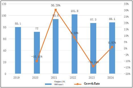 Figure 3Production and Growth Rate of Graphite Electrodes in China during 2019 - 2024