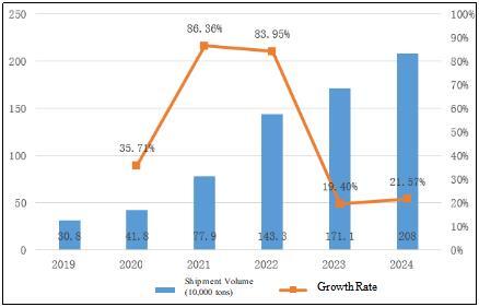 Figure 5Shipments and Growth Rates of Negative Electrode Materials for Lithium Batteries in China during 2019-2024