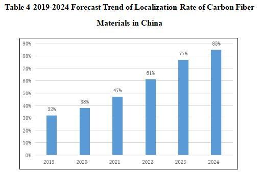 The localization rate of carbon fiber materials in China was 32% in 2019, 38% in 2020, 47% in 2021, 61% in 2022, 77% in 2023, and reached 85% by 2024. With the continuous development of China’s carbon fiber industry, the competitiveness of domestic enterprises is gradually increasing, and the market size is expected to continue to expand under the promotion of localization, with broad prospects.