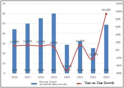 Figure 1 Domestic Tourist Arrivals and Growth in China from 2016 to 2023