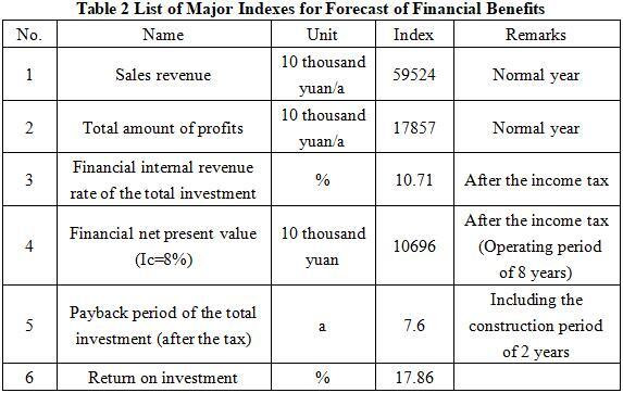 After the project reaches the production capacity, its annual sales revenue will be 595.24 million yuan, its profit will be 178.57 million yuan, its investment payback period will be 7.6 years (after the tax, including the construction period of 2 years) and its return on investment will be 17.86%.
