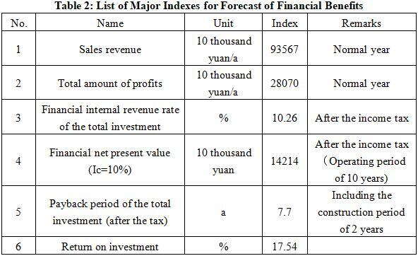 After the project reaches the production capacity, its annual sales revenue will be 935.67 million yuan, its profit will be 280.7 million yuan, its investment payback period will be 7.7 years (after the tax, including the construction period of 2 years) and its return on investment will be 17.54%.