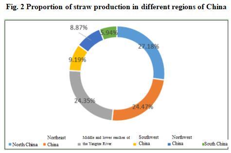 From the perspective of production, the production of straw was in North China, Northeast China, the middle and lower reaches of the Yangtze River, the southwest region, the Northwest region and the South China region, accounting for 27.18%, 24.47%, 24.35%, 9.19%, 8.87% and 5.94% of the total straw production in China, respectively.