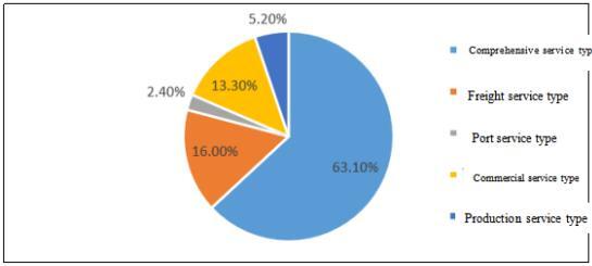 According to the logistics resources and market demand characteristics that the park relies on, and based on the service objects and functions, the parks is divided into five categories: freight service type, production service type, commercial service type, port service type, and comprehensive service type. The survey results show that comprehensive service-oriented parks account for the highest proportion, reaching 63.1%, followed by freight service-oriented parks at 16.0%, commercial service-oriented parks at 13.3%, and production service-oriented and port service-oriented logistics parks at 5.2% and 2.4%, respectively.