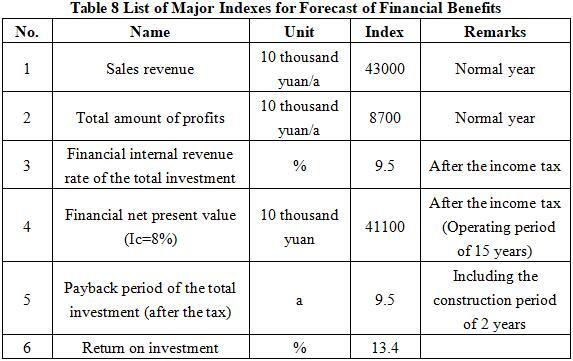 After the project reaches the production capacity, its annual sales revenue will be 430 million yuan, its profit will be 87 million yuan, its investment payback period will be 9.5 years (after the tax, including the construction period of 2 years) and its return on investment will be 13.4%.