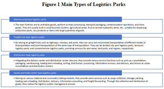 A logistics park refers to a place where multiple logistics facilities and different types of logistics enterprises are concentrated in space in areas where logistics operations are concentrated and where several transportation modes are connected. It is also a gathering point for logistics enterprises with a certain scale and multiple service functions. Logistics parks mainly including warehousing-type logistics parks, freight hub-type logistics parks, distribution-type logistics parks, and goods and trade center-type logistics parks.