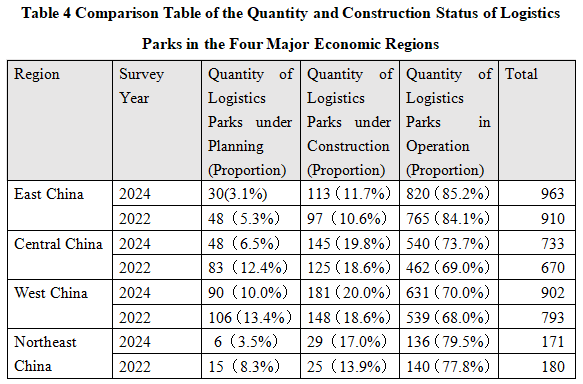 The proportion of logistics parks (hereinafter referred to as “parks in operation”) put into operation in the four major economic regions has increased to varying degrees. Among them, the proportion of operating parks in the central region is 73.7%, the highest increase, which is 4.7 percentage points higher than the 69.0% surveyed in 2022; the proportion of parks in operation in the eastern region is 85.2%, the highest among the four economic regions; the proportion of parks in operation in the western and northeastern regions is 70.0% and 79.5%, respectively, an increase of about 2 percentage points compared to the 2022 survey.
