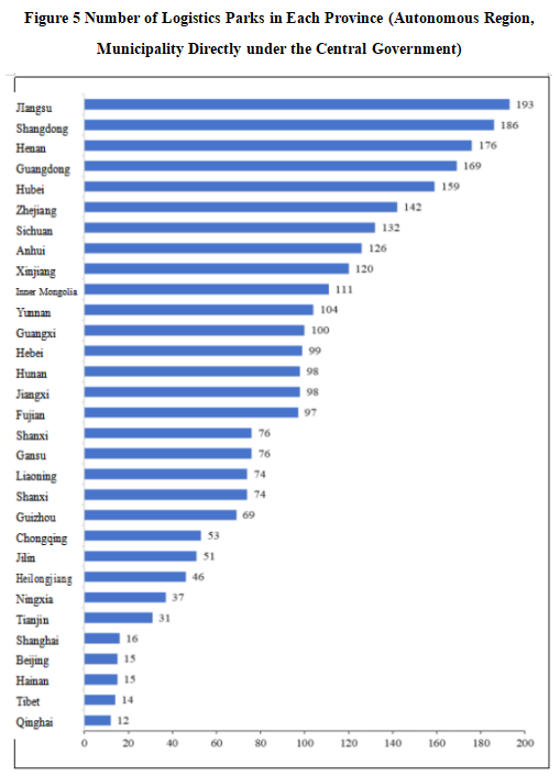 The top three provinces in terms of the total number of logistics parks are Jiangsu, Shandong, and Henan. There are over 100 logistics parks in 12 provinces across the country.