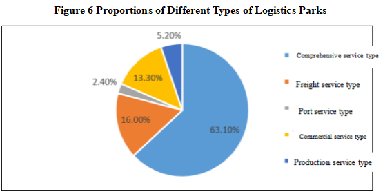 According to the logistics resources and market demand characteristics that the park relies on, and based on the service objects and functions, the parks is divided into five categories: freight service type, production service type, commercial service type, port service type, and comprehensive service type. The survey results show that comprehensive service-oriented parks account for the highest proportion, reaching 63.1%, followed by freight service-oriented parks at 16.0%, commercial service-oriented parks at 13.3%, and production service-oriented and port service-oriented logistics parks at 5.2% and 2.4%, respectively.