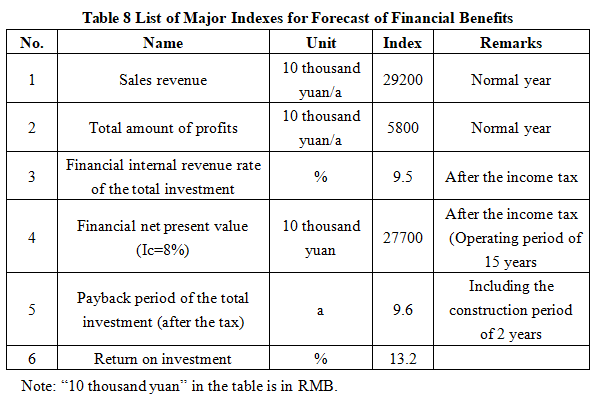 After the project reaches the production capacity, its annual sales revenue will be 292 million yuan, its profit will be 58 million yuan, its investment payback period will be 9.6 years (after the tax, including the construction period of 2 years) and its return on investment will be 13.2%.