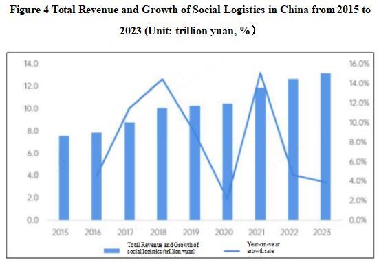 From the perspective of total logistics costs, the total logistics costs in China continue to grow. The total cost of social logistics in 2023 was 17.8 trillion yuan, a year-on-year increase of 2.3%, with a slight decline in growth rate.