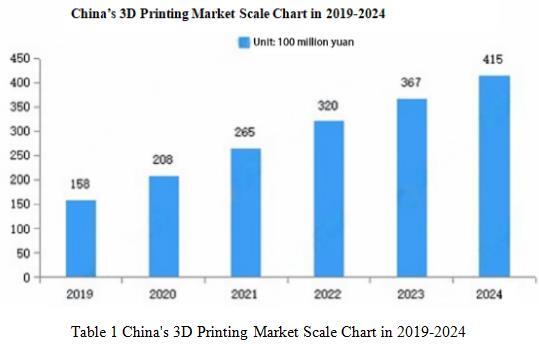 In recent years, driven by the gradual large-scale application of 3D-printed products and the release of some pent-up demand for 3D printing equipment, the market scale has continued to grow. In 2022, the market scale of 3D printing in China was approximately 32 billion yuan, with a year-on-year growth of 20.75%. In 2023, the market scale reached 36.7 billion yuan. The market scale reached 41.5 billion yuan in 2024.