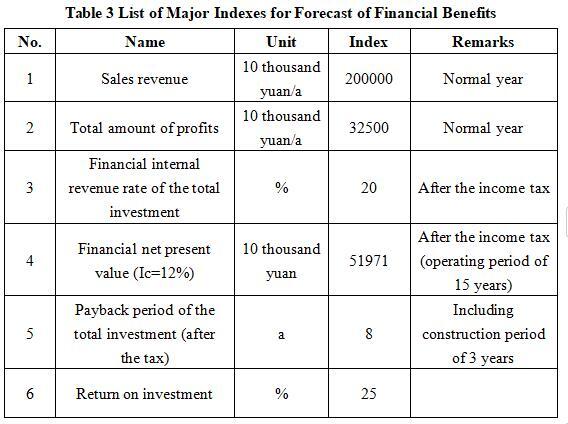 After the project reaches the production capacity, its annual sales income will be 2 billion yuan, its profit will be 325 million yuan, its investment payback period will be 8 years (after the tax, including construction period of 3 years), and its return on investment will be 25%.