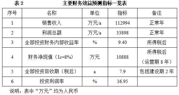 项目达产后,年销售收入112994万元,利润33898万元,投资回收期7.9年(税后,含建设期2年),投资利润率16.95%。
