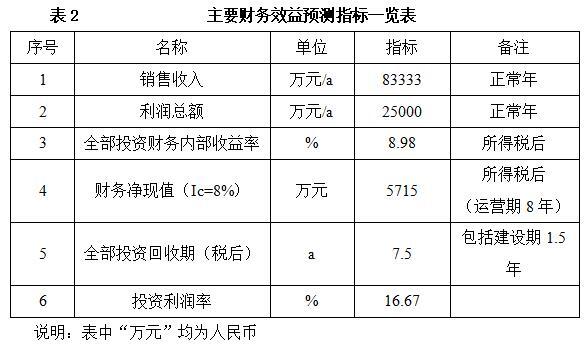 项目达产后,年销售收入83333万元,利润25000万元,投资回收期7.5年(税后,含建设期1.5年),投资利润率16.67%。