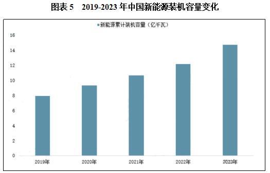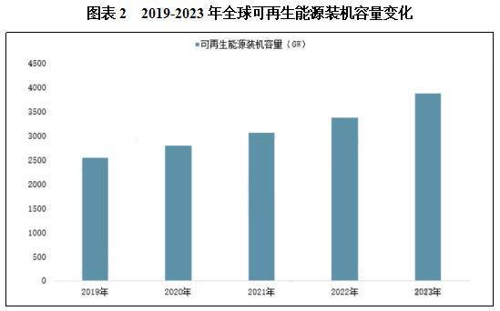 全球新能源利用产业快速发展的主要原因在于,随着应对气候变化的国际努力及能源低碳化越发成为共识,越来越多国家开始重视开发利用新能源,并相应出台更多产业扶持政策及绿色复苏计划,加快推动能源结构向低碳转型。例如,韩国公布了一项可再生能源长期计划,加大可再生能源电力开发;根据该计划,到2034年,韩国所有燃煤电厂都将退役,可再生能源在韩国能源结构所占比例将从目前的15.1%提高到40%。法国政府公布的“2030国家能源计划”称,将持续提高其电力供给领域中可再生能源发电的占比,特别是风电占比,以实现能源转型;到2030年法国电力供给中可再生能源发电占比将达到40%,其中,风电占比预计达到20%;德国计划将可再生能源比例从目前的18%提升至30%。根据国际可再生能源署(IRENA)统计公布数据,截至2023年底,全球可再生能源装机容量已达到3870吉瓦,同比增长14.77%,较2019年复合增长了11.13%。