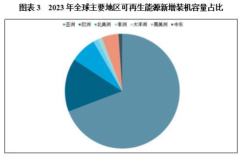 太阳能发电作为全球可再生能源利用的主要市场,值得关注的是,2023年全球太阳能发电新增装机容量几乎全部来自光伏发电,新增装机容量约为345.5吉瓦,而光热发电仅新增0.3吉瓦。且亚洲仍是太阳能发电装机新增容量的主要地区,2023年亚洲新增太阳能发电容量为237.7吉瓦,其中91.2%来自中国(新增216.9吉瓦),印度和日本分别新增9.7吉瓦和4.0吉瓦。除了亚洲地区,2023年美国新增太阳能发电装机容量24.8吉瓦,德国和巴西分别新增14.3吉瓦和11.9吉瓦。