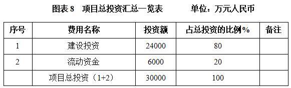 本项目总投资为30000万元,其中:建设投资24000万元,流动资金6000万元。