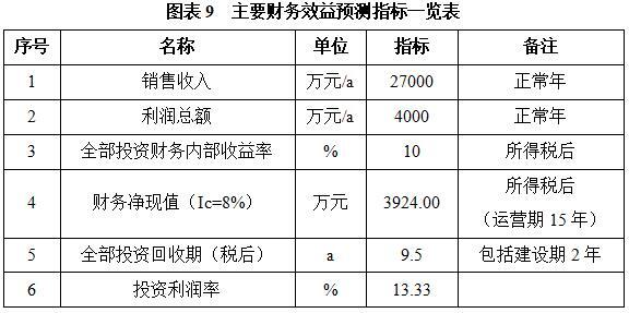 项目达产后,年销售收入27000万元,利润4000万元,投资回收期9.5年(税后,含建设期2年),投资利润率13.33%。