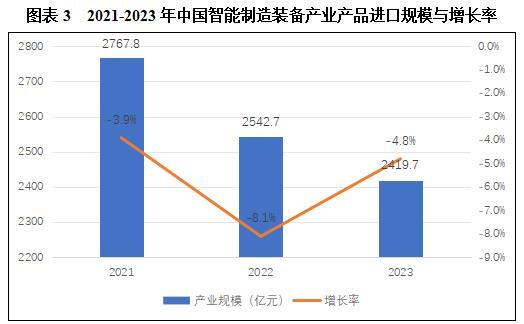 近三年中国智能制造装备产业进口规模整体呈下降趋势,2022年下降幅度最大,达到8.1%。进口规模的持续下降表明了国内的市场满足率不断提升,智能制造装备产业稳定向好,制造业内生创新能力不断增强,生产方式、企业形态、业务模式和就业方式加速变革。