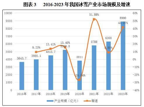 2016年至2019年,我国冰雪产业市场规模逐年增长,受疫情影响,2020年冰雪产业规模降低到3811亿元。2021年,中国冰雪产业逐渐回温,市场规模达5788亿元,同比增长51.88%;2022年产业规模为6300亿元。随着疫情防控放开,我国冰雪旅游消费保持快速增长态势,冰雪旅游正在从“有没有”向“好不好”转变。2023年我国冰雪产业市场规模达到了8900亿元。《中国冰雪产业发展研究报告(2024)》预测2024年我国冰雪产业市场规模将达到9700亿元,预测2025年将突破10000亿,达到10053亿元。