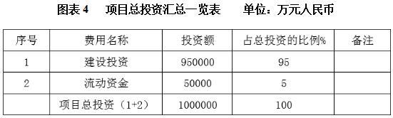 项目总投资为1000000万元,其中建设投资950000万元,流动资金50000万元。