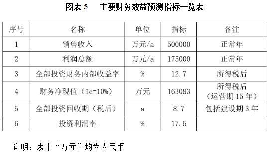 项目达产后,年销售收入500000万元,利润175000万元,投资回收期8.7年(税后,含建设期2年),投资利润率17.5%。