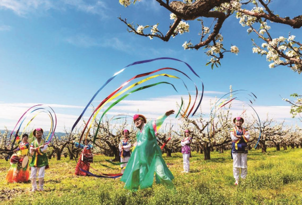 万亩梨园里,舞者们身着民族服饰在树下翩翩起舞,欢快的氛围与春日美景相融。 柳天水 摄