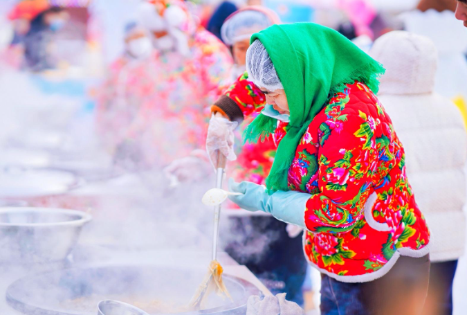 “东北的年味不只有冰雪,还有美食啊!”一位来自湖南的游客一手端着猪肉炖粉条,一手捧着酸菜汤,乐呵呵地与家人打趣道。